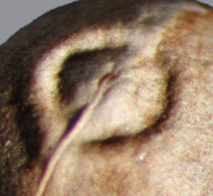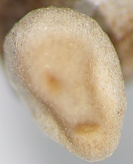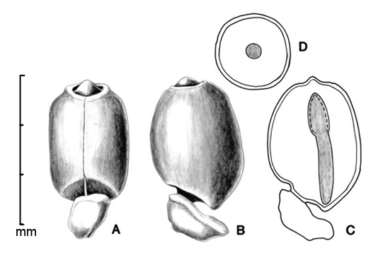 Fruit a strongly trilobate and explosively dehiscent capsule, with one   seed in each of the three chambers. Capsule 3–4 mm long, 4–5 mm diameter,   smooth. Seeds broadly ovate to broadly oblong, subterete, 2.0–3.0 mm long,   1.5–2.0 mm in diameter; base of seed flat, oblique, with hilum usually obscured   by persistent cartilaginous caruncle. Caruncle boat-shaped, up to 1.5 mm long,   mildly sparkly, cream-colored, stalked, appressed obliquely to testa. Raphe a   prominent dark line extending longitudinally from the hilum to the chalazal area   at the apex. Chalaza prominent, round, depressed, 0.7 mm across. Testa minutely   pitted and appearing smooth, greyish-white to bluish-grey to tan, and usually   mottled or flecked with brown or black markings. Hilum darker than testa,   grading into raphe. Embryo spatulate; endosperm readily visible.