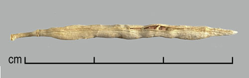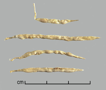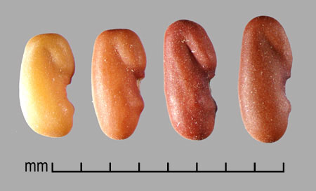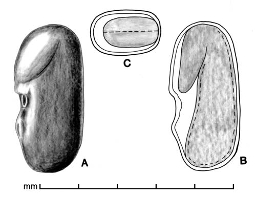 Fruit a dehiscent legume with 2–10 seeds. Seeds oblong to reniform, umbo absent, 3–4.5 mm long, 1–2 mm wide, 1.2–1.5 mm thick, with an oblique furrow on each face extending from hilar area. Cross sectional outline elliptic to oblong. Testa smooth, dull to faintly glossy, green, yellow to reddish-brown. Pleurogram absent. Hilum marginal, +/– recessed, round, with a hilar groove (faboid split). Lens a mound. Embryo bent, cotyledons ca. twice as long as radicle; endosperm present.