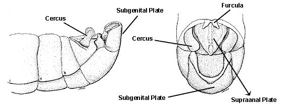 Male grasshoppers are distinguishable by the cerci, furcula, subgenital and supraanal plates.