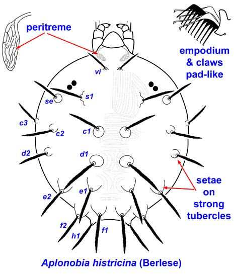 - A. histricina (Berlese) the soursob mite feeds primarily on Oxalis spp., but may damage pear.