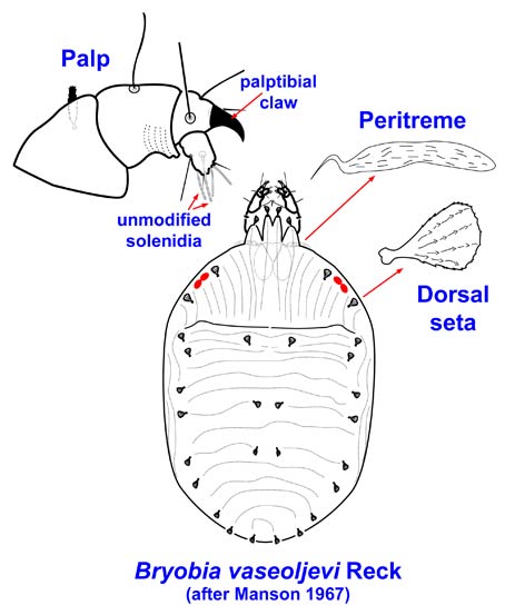 Manson DCM. 1967. The spider mite family Tetranychidae in New Zealand L.: The genus Bryobia. Acarologia 9: 76-123.