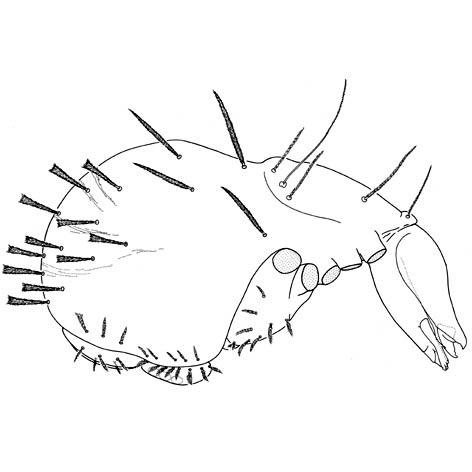 The globular body and highly modified legs I are reminiscent of Sphaerolichus, but the long flagellum, single prodorsal sensillus, and array of pilose, cuneiform opisthosomal setae are distinctive.