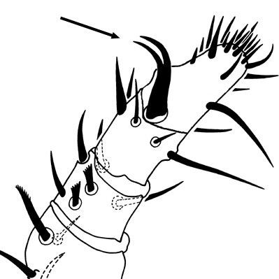 (= palp apotele, palptarsal claw) the most distal segment of the palp; absent in Acariformes, claw-like in Opilioacarida, and a subdistal, tined structure in the Mesostigmata., etc.