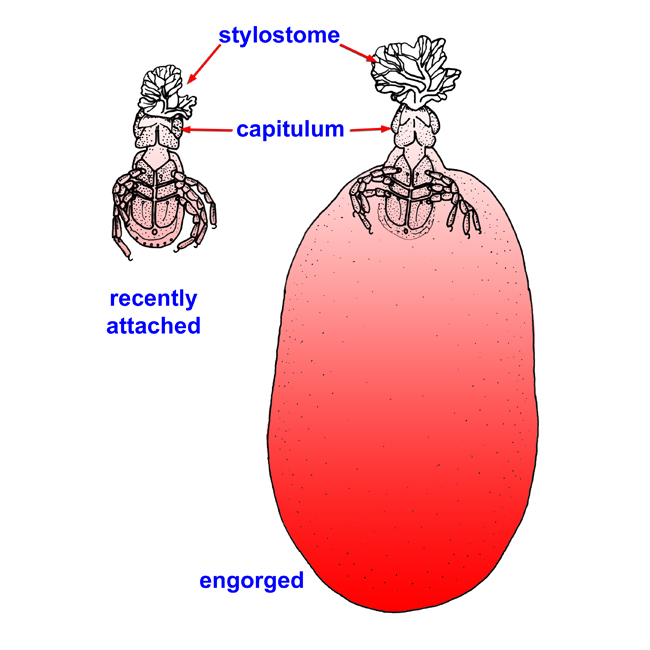 Large parasitiform mites (to 6 mm unfed, 3 cm when engorgedengorged: