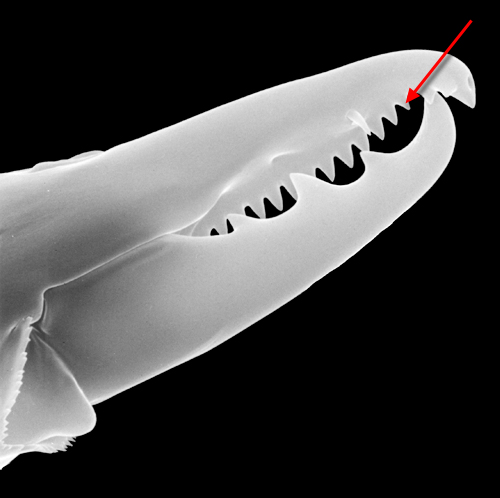 (pl. pili dentilis) a seta-like or membranous sensory organ inserted ventrolaterally on the fixed digit of the chelicera of many Mesostigmata.