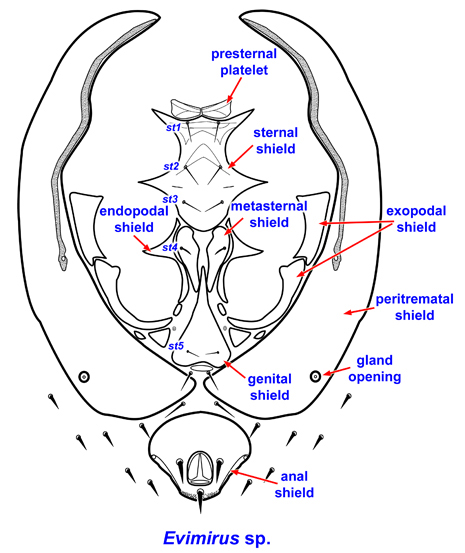 is on an intercoxal shield and is covered by a subcircular valve. Phoretic deutonymphs have a cylindrical anal process and 1–2 dorsaldorsal: