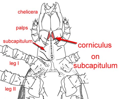 (pl. corniculi) (also, external malae) a usually horn-like process (sometimes toothed, bifurcate, trifurcate, spine-like, spatulate, or membranous) on the subcapitulum of parasitiform mites that usually supports the salivary styli.  A toothed corniculus could be confused with a rutellum, a possibly homologous structure in Acariformes and Opilioacarida. Phytoseiid image is spatulate corniculus.