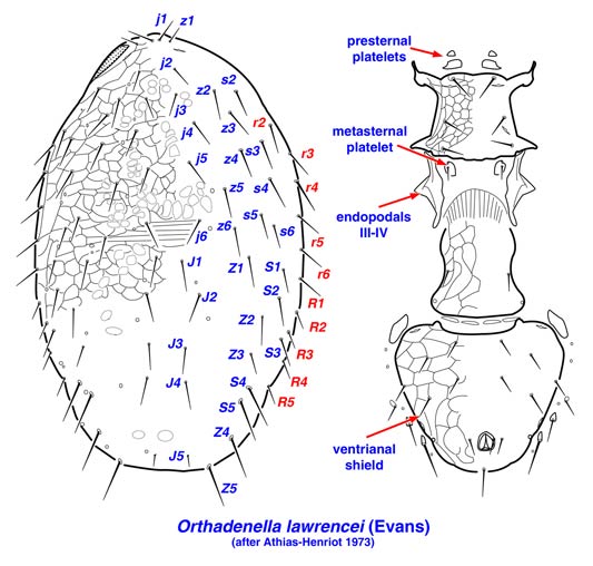 Two species of Orthadenella are described, O. lawrencei (Evans) from meadow and forest soils in Europe and O. tennesseensis (DeLeon) from moss, hardwood logs, pine trees attacked by scolytid bark beetles, and bracket fungi in North America.