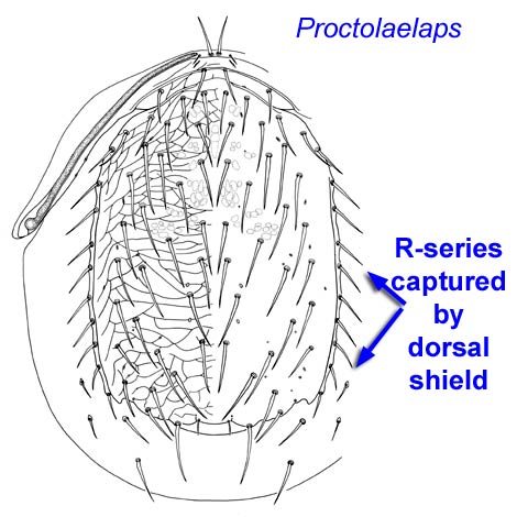 shields that capture most of the R-series, but the Proctolaelaps hystrix group captures only R1–4 (R5–7 in soft cuticle) and is similar to Mucroseius, but lacks the distaldistal: