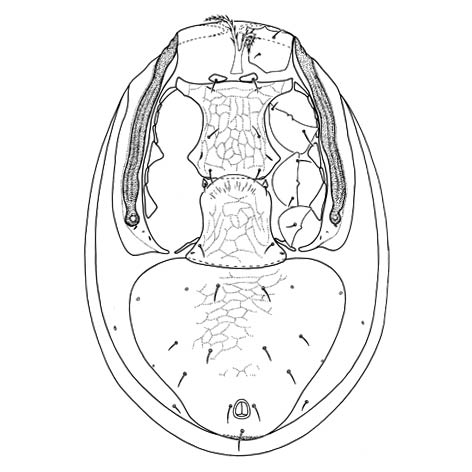 a shield that covers all of the dorsum. In Mesostigmata, the holodorsal shield is often interpreted as resulting from the fusion of podonotal and opisthonotal shields and a suture between these regions is often visible (see recurved and procurved).