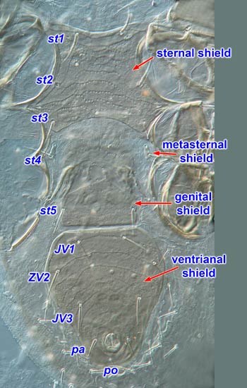 (st1–3) and 2 pairs of lyrifissures; metasternal shields present, bearing st4 and stp3; genital shieldgenital shield: