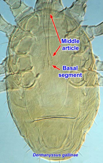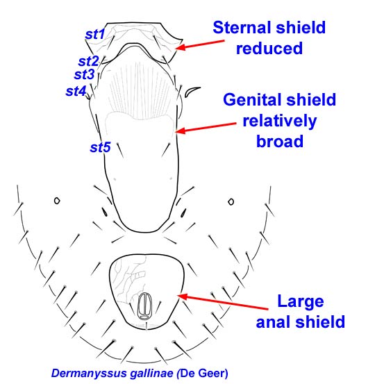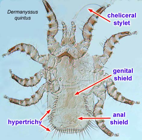 Moss WW. 1968. An illustrated key to the species of the acarine genus Dermanyssus (Mesostigmata: Laelapoidea: Dermanyssidae). Journal of Medical Entomology 5: 67-84.