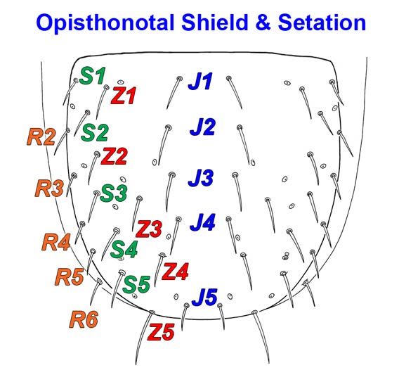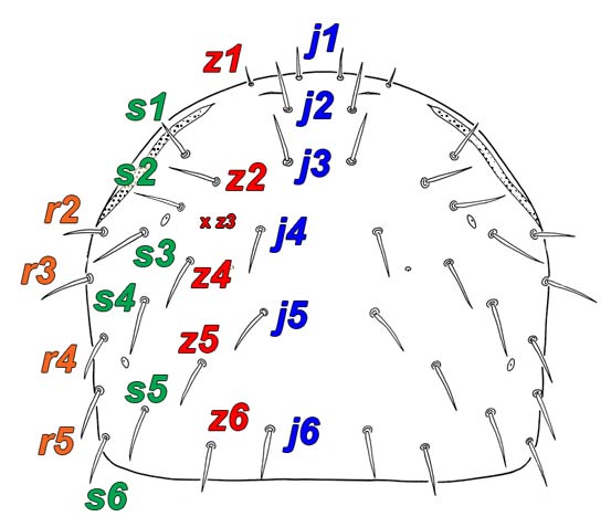 3 scleronoduli (median unpaired); j1–2, z1, and s1 on anterior margin of podonotal shieldpodonotal shield:
