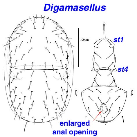 ; anal opening sometimes enlarged (Digamasellus). Tarsustarsus: