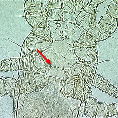 (= palp apotele, palptarsal claw) the most distal segment of the palp; absent in Acariformes, claw-like in Opilioacarida, and a subdistal, tined structure in the Mesostigmata. 3-tined.............................. 6