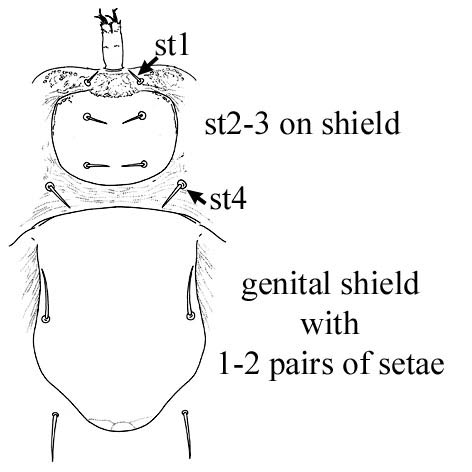 setaa elongate, laterad and parallel to digits. Male genital opening on intercoxal shield, valve with or without a pair of setaeseta: