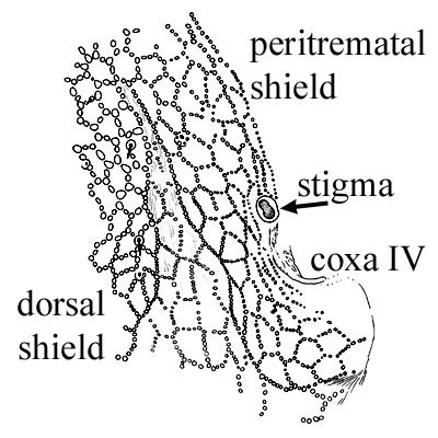 . Inguinal glands on small platelets behind coxae IV. Anal opening with 2 valves in small anal shieldanal shield:
