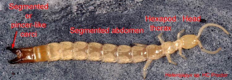 Distinguishing features: long moniliform antennae; long, many segmented pair of cerci or single-segmented pincer-like cerci; eyes absent