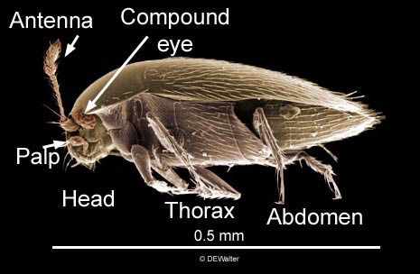 in some (e.g., scale insect crawlers). Insects can usually be distinguished from mites by their antennae, compound eyes, wings, or clear segmentationsegmentation: