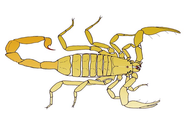 Distinguishing features: 'tail' of ring-like metasomal segments ending in sting; pincer-like claws (pedipalps).