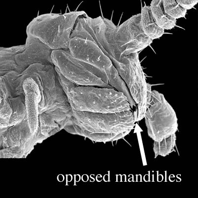 Mouthparts: entognathous mandibles, maxillae, labium (fused 2nd maxillae)