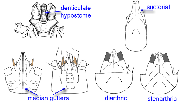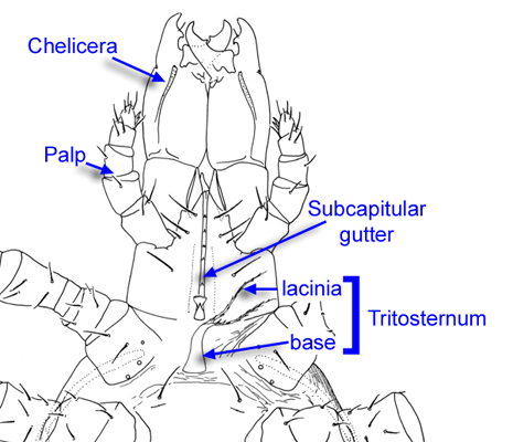 Mouthparts: 2–3 segmented chelicerae; pedipalps (palps) with 1–5 free segments; pedipalpal coxae fused into subcapitulumsubcapitulum: