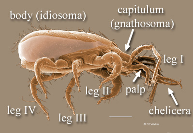 Legs: 1–4 pairs, typically 3 pairs in larvae, 4 pairs in nymphs and adults (rarely 2 pairs, 1 pair)