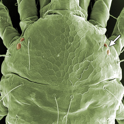 (pl. ocelli) a simple eye.  Mites with eyes usually have one or two pairs of lateral ocelli, but some Opilioacarida have three pairs.  Additionally, some acariform mites have one or two median ocelli on the underside of the naso.