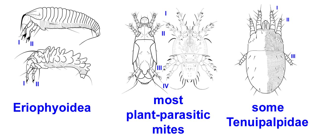 The Tetranychoidea usually have 4 pairs of legs in the nymphs and adults; however, legs IV are not expressed by species in several genera of Tenuipalpidae including: Larvacarus, Raoiellana, and Phytoptipalpus.
