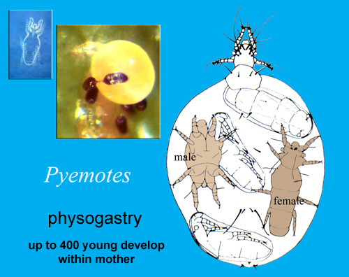 swelling of the opisthosoma to accommodate massive numbers of eggs or developing young. Physogastry is common only in certain heterostigmtans including Pyemotidae, Pygmephoridae, and Podapolipidae.