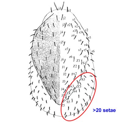 is exposed soft cuticle. In most species, this soft cuticle bears seta r6 and less than a dozen setae in the Marginal (R-) and Submarginal (UR-) series. Additionally, 9 pairs of setae are usually present in the Ventralventral: