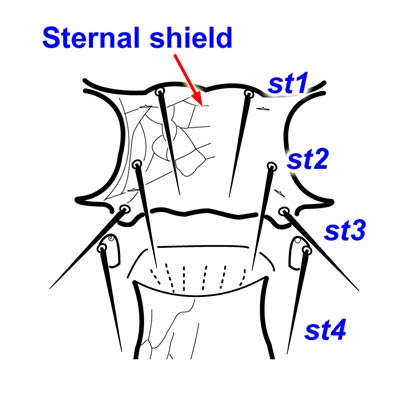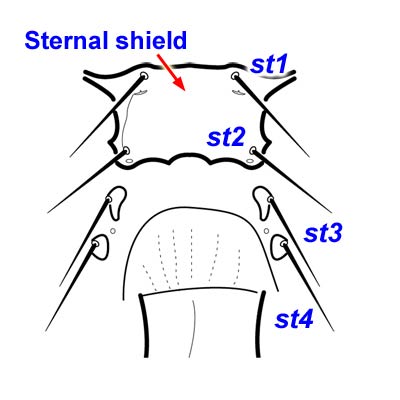 in Mesostigmata, the five pairs of setae in the intercoxal region designated st1-5; st1-3 are present in the larva and usually are borne on a sternal shield in the adult female; st4, the metasternal setae, are added in the deutonymph, often are borne on metasternal platelets, and sometimes on the sternal shield; st5, the genital setae, are added in the protonymph and usually borne on or are inserted laterad the epigynal shield in the adult female.