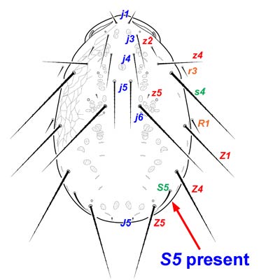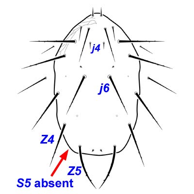 shield setae than other species in the genus, with seta j5 and seta S5 absent. Seta S5 is present and simplesimple: