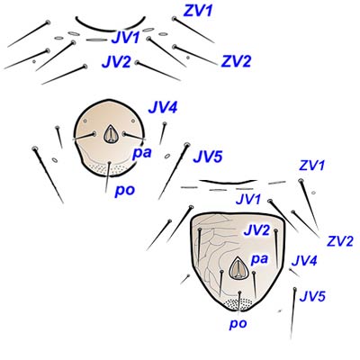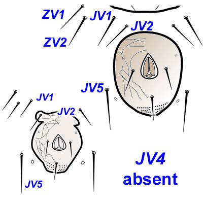 Ventralventral:relating to the lower or under side; opposed to dorsal. seta JV4 is present in Phytoseiulus longipes and absent in both P. persimilis and P. macropilis.