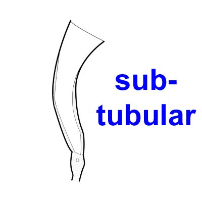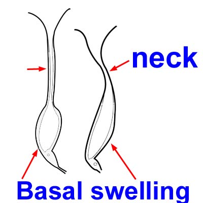 that is nearly tubular in in P. longipes, broadly funnel-shaped in P. fragariae and vase-shaped with a narrow neckneck: