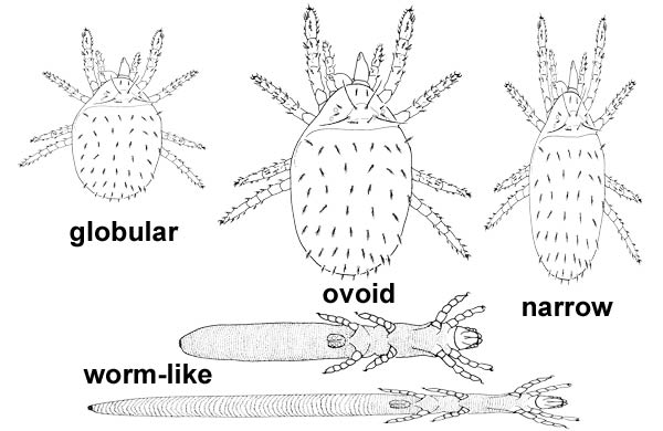 elongate, with reduced legs as in some Nematalycidae (Endeostigmata).