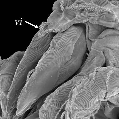 that projects over the chelicerae and may or may not bear the rostral setae (ro = vi).