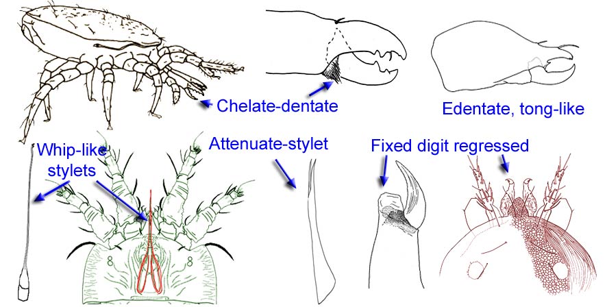 to a lobe or membranous sheath for the movable digit, and in spider mites (Fig. 1) and their relatives (Tetranychoidea), gall mites and their relatives (Eriophyopidea), and a few other groups (e.g., some parasitic Mesostigmata, suctorialsuctorial: