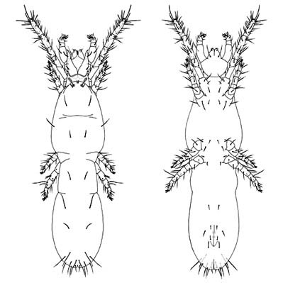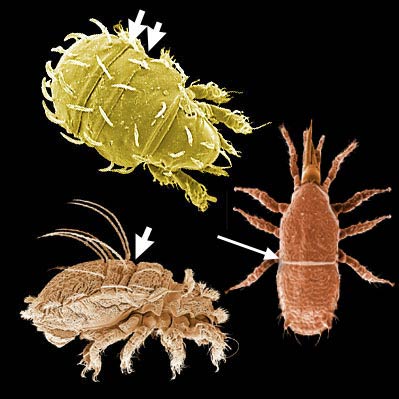 a body appearing to be divided between legs II-III by a flexible sejugal furrow (Acariformes). mites have the ability to fold in their legs and mouthparts and close-up to resemble a seed, an ability called ptychoidy or jacknifing.