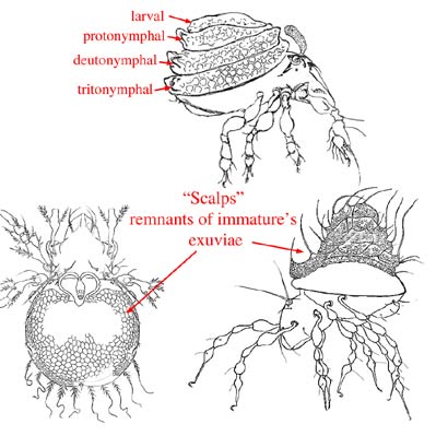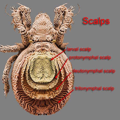 notogasteral remnants of the cuticle of previous instars as a single or multiple 'scalps' piled on their backs.