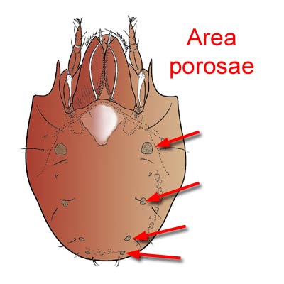 , typically between the chelicerae or on its lateral margins. Many oribatid mites have uniquely derived but obscure respiratory systems; they also have secretory organs called area porosae that were once thought to be respiratory.