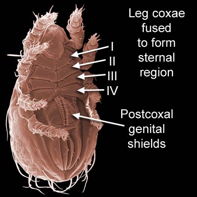 and the intercoxal region is occupied by sternal elements anteriorly and anteriorly intruding genital elements posteriorly. The sternal elements are well sclerotized in the Holothyrida and Mesostigmata, typically in the form of a large sternal shieldsternal shield: