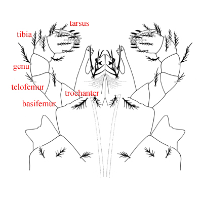 (Greek apotelein = to complete)—the terminus of an appendage; the most distal leg segment, often consisting of an empodium and a pair of claws. The apotele of a leg is usually treated as equivalent to the pretarsus or some part thereof (e.g., the claws and empodium), but the palptarsal apotele in Mesostigmata is a tined structure originating at the base of the palptarsus and thought to be a remnant of the claws. The chelicerae are also an appendage and terminate in the movable digit., tarsustarsus: