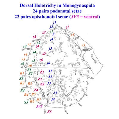The anteriormost seta in the r-series, r1, is probably the rarest seta in all of the Monogynaspida. It is clearly present only in some Zerconidae (on the peritrematalperitrematal: