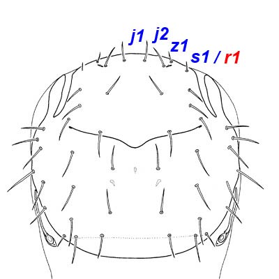 Lee DC. 1970. The Rhodacaridae (Acari: Mesostigmata); classification, external morphology and distribution of genera. Records of the South Australian Museum 16: 1–219. argued that seta j2 is in an anterior position, r1 is absent, and the setae on the anterior margin are j1, j2, z1, s1.