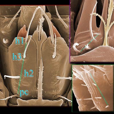 In Platyseiidae and some Arctoseiinae (Ascidae), both the internal palptrochanteral seta (al) and the anterior hypostomatal seta (h1) are elongate, curled and whip-likewhip-like: