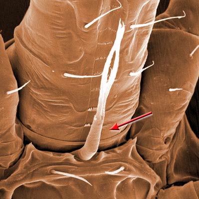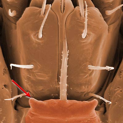 the sternum of the 3rd body segment (between legs I); produced as a biflagellate structure in Mesostigmata, although sometimes the flagellae (laciniae) are partially or completely fused.