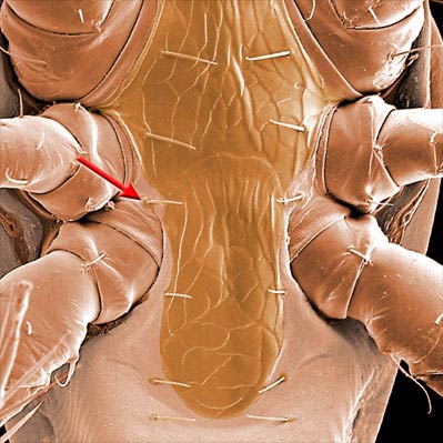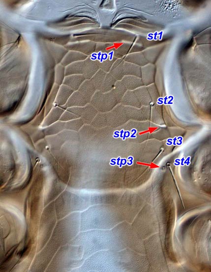 in Mesostigmata, the five pairs of setae in the intercoxal region designated st1-5; st1-3 are present in the larva and usually are borne on a sternal shield in the adult female; st4, the metasternal setae, are added in the deutonymph, often are borne on metasternal platelets, and sometimes on the sternal shield; st5, the genital setae, are added in the protonymph and usually borne on or are inserted laterad the epigynal shield in the adult female.