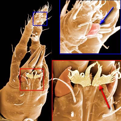 (= palp apotele, palptarsal claw) the most distal segment of the palp; absent in Acariformes, claw-like in Opilioacarida, and a subdistal, tined structure in the Mesostigmata. for the membranous scale that is diagnostic for