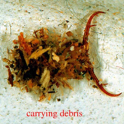 Other mites (e.g., some Tarsonemidae (Fungitarsonemus), some Uropodina), and some insects collect pieces of debris, often including balls of algae, lichens, or pollen, and pile them up in mounds or layers on their backs (presumably using a glue or wax to attach the debris).